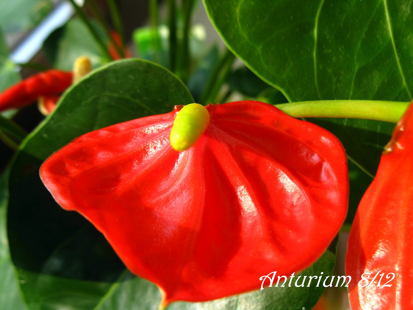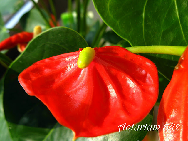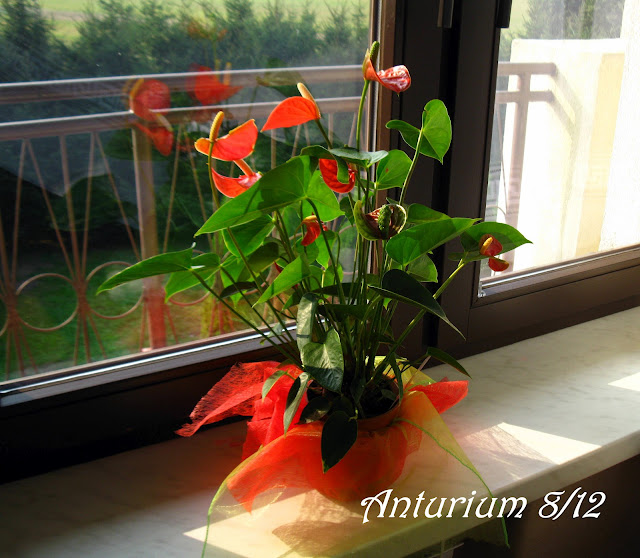 Wydaje się, że temu Anthurium jest dobrze u mnie. Pielęgnuję go z najwyższą starannością tzn. podelewam, gdy ziemia na głębokość 2 cm jest sucha, robię to tylko odstaną, letnią wodą z dodatkiem odżywki do roślin kwitnących. Nigdy nie używam zimnej wody, gdyż pogarsza się stan liści. Często delikatnie przecieram listeczki mokrą ściereczką. Pryskanie wodą się nie sprawdziło, gdyż na kwiatach zrobiły się maleńkie brązowe plamki. Teraz we wrześniu, gdy słońce nie operuje tak mocno przeniosłam kwiatka z północnego na wschodni parapet. Niestety małe korzonki już wyglądają ze spodu doniczki, ale poczekam do przekwitnięcia roslinki, albo może do wiosny i przesadzę ją do nowego posłoża.